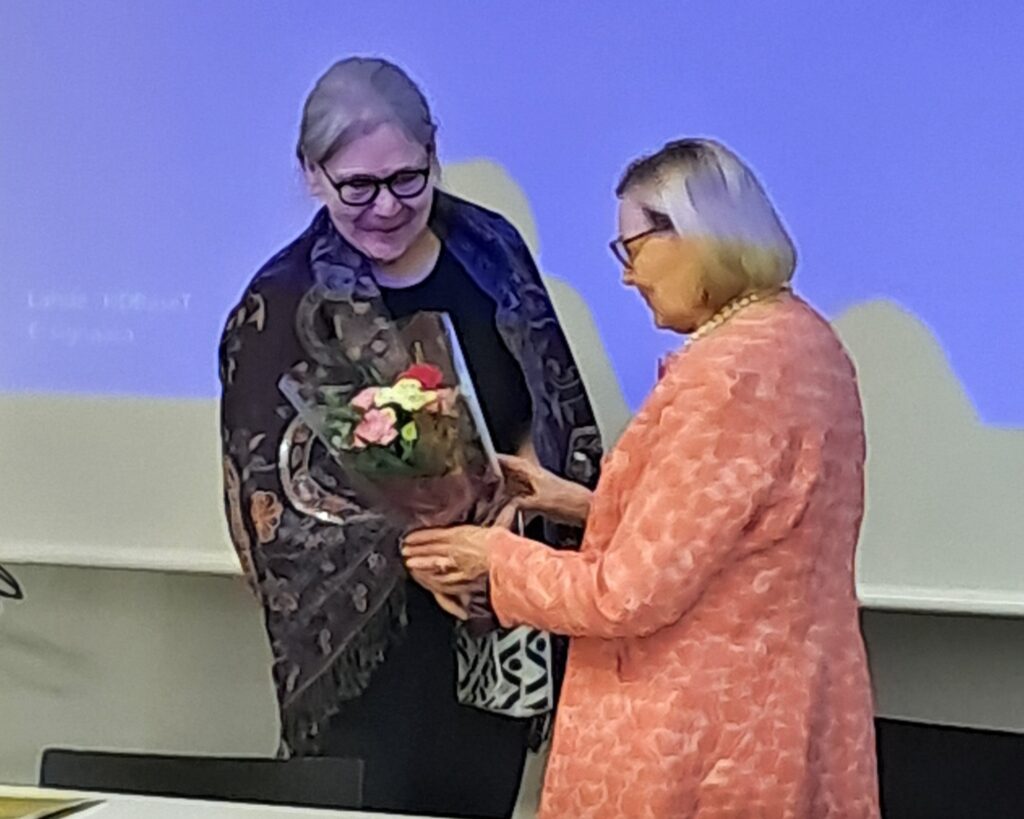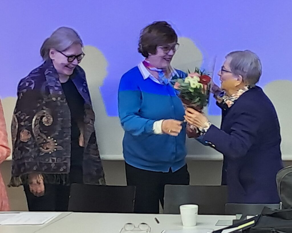 Kuvissa Vas: Yhdistyksen puheenjohtaja Tarja Sokka ojentaa kukkia vuosikokouksen puheenjohtajana toimineelle Arja Ropolle. Oik: Yhdistyksen rahastonhoitaja Ulla Tapola ojentaa kukkia vuosikokouksen sihteerinä toimineelle Eva Hänninen-Salmelinille